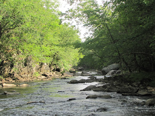 On a whim, Laurie and I decided to go there yesterday. It could not have been a better idea. The weather was comfortable, the trail was dry and the scenery was gorgeous. Right below the parking lot is a dam with a waterfall going over it. Just upstream from the dam is a canoe launch. Just downstream is a trail that runs along the edge of the river for half a mile. The river runs through a small gorge. It narrows and there are cliffs along both sides. The description says the cliffs rise 100 feet. I don't know about that, but I'd say there are spots you can look straight down at the water forty or fifty feet below.